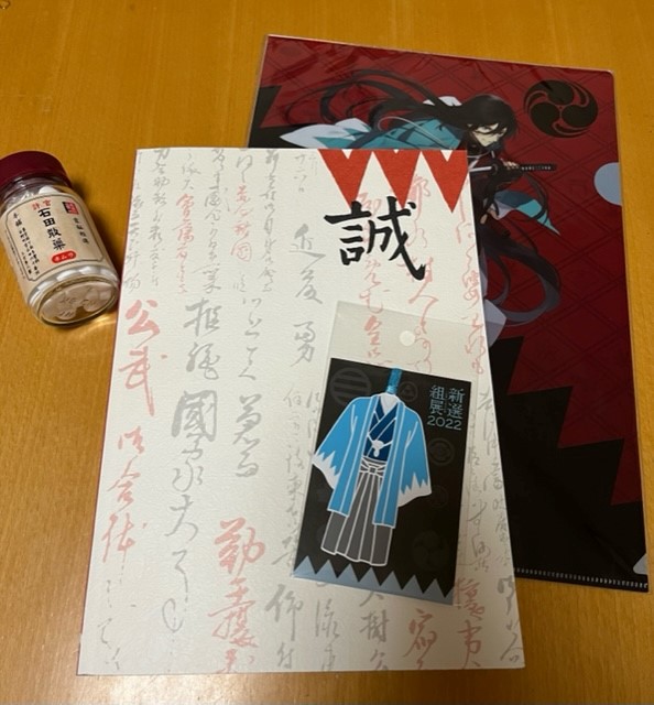 展示物が見終った後のショップでは図録とコラボのクリアファイルセット、新選組の羽織の形の栞、石田散薬のラムネを購入しました。
