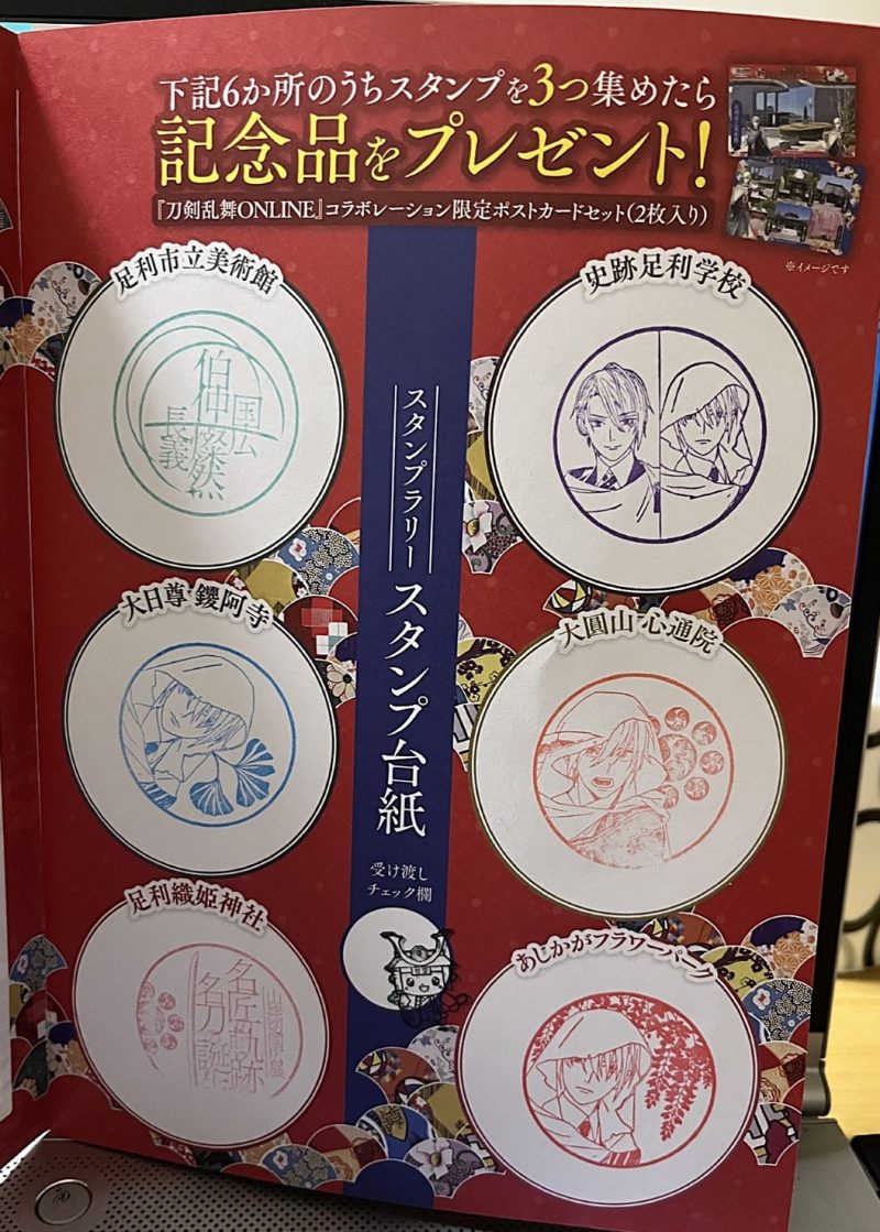 入場券を購入する所の近くにある休憩所みたいな所には、山姥切国広の押形の複製品が飾っていて、スタンプが設置されている場所には、二振りの声優さんのサインが飾られていました。