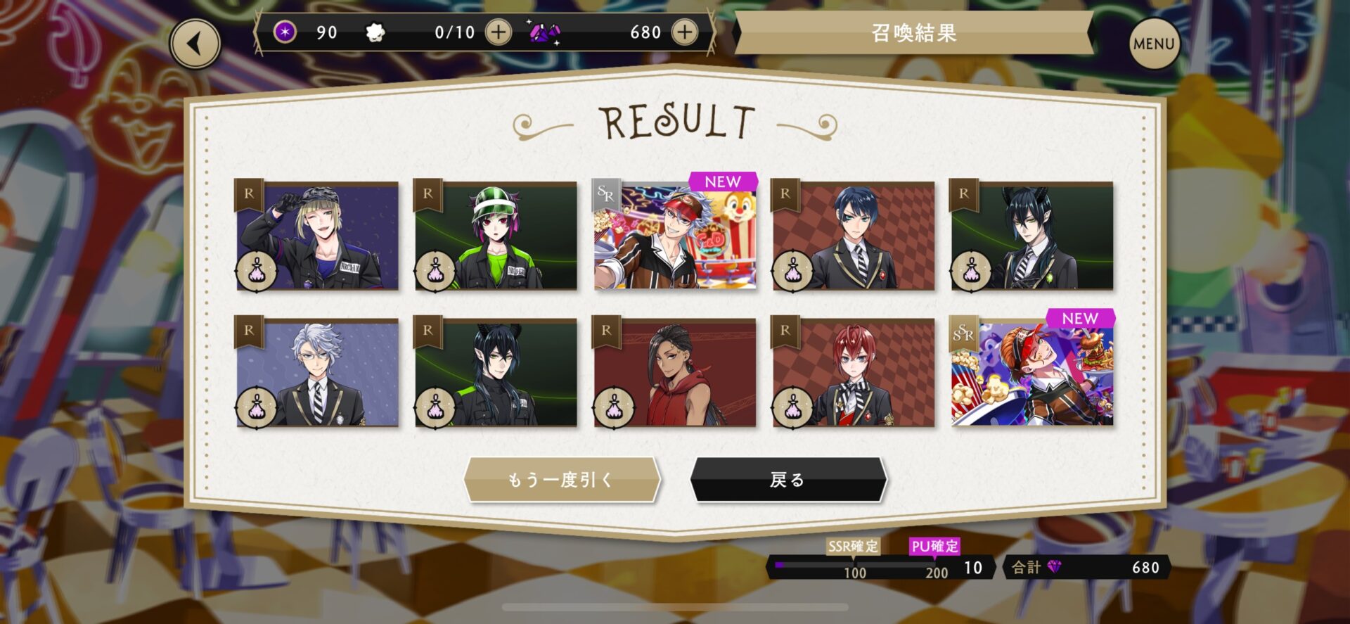 「まあ今回は10連でアズールが来てくれたらいいかな~」程度の軽い気持ちで回してみたら、初っ端からグリムがバルコニーにいて「え!!?もしや!?」とドキドキしながら画面を見守っていると、10連でSRアズールとSSRケイトが来てくれました!