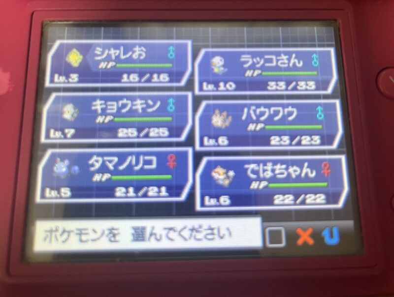 牧場のハーデリーを探しながら、ヨーテリーの「バウワウ」、マメパトの「キョウキン」、ルリリの「タマノリコ」、クルミルの「シャレお」を仲間にして初期パーティーができたので、ついでにレベル上げもしました。