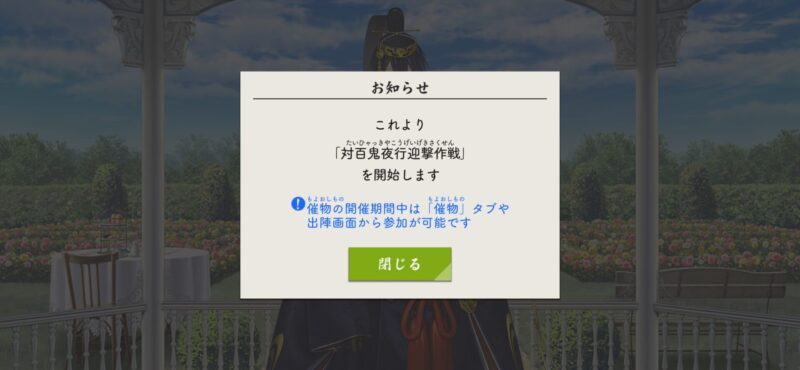 最初の狐ヶ崎と三日月宗近朧の会話は去年と違うものだったので、前回の百鬼夜行とは本当に内容が違うみたいです。