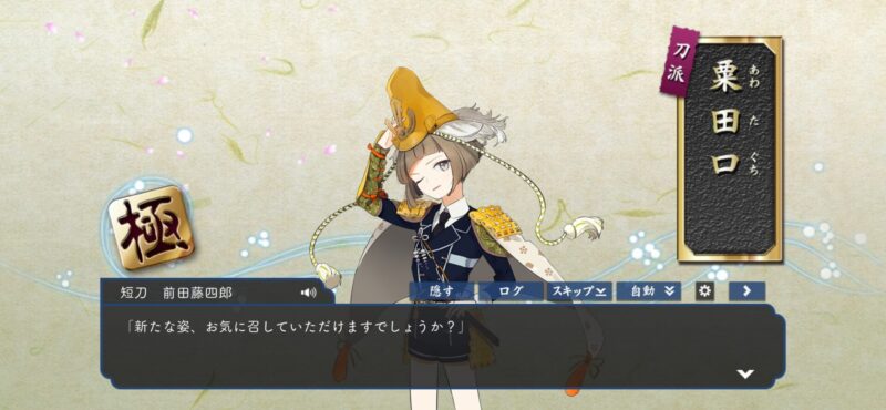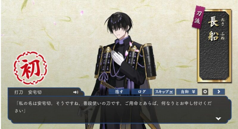 近侍ボイスの「では、何をいたしましょうか。お昼寝の支度? おやつの準備。普段使いの刀ですから、便利に使ってください」の口調が本当に柔らかくて、もう一度長谷部のボイスを聞いてみると、長谷部のボイスが「お風呂にする?ご飯にする?それとも私?」みたいな微笑ましい圧(?)がある声に対して、彼の話し方を聞いて「人に仕える事が染みついた刀なんだな」と思いました。