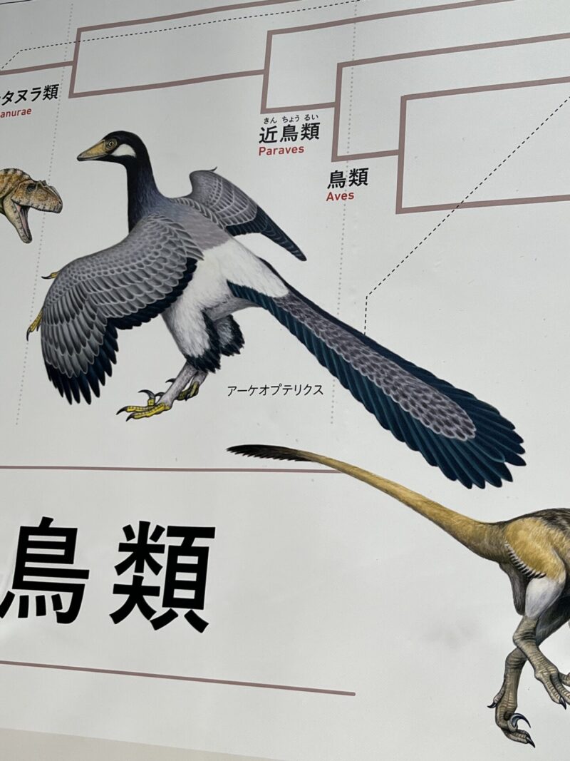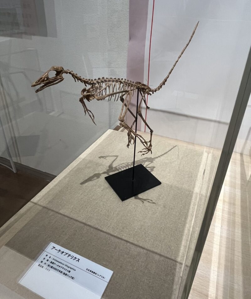 そこで始祖鳥であるアーケオプテリクスの骨格標本のレプリカが展示されていたのですが、骨が全部細くて、特に脚の骨は頼りなさそうで、「指で挟むだけでも折れるかも」と思えるくらいに細かったです。